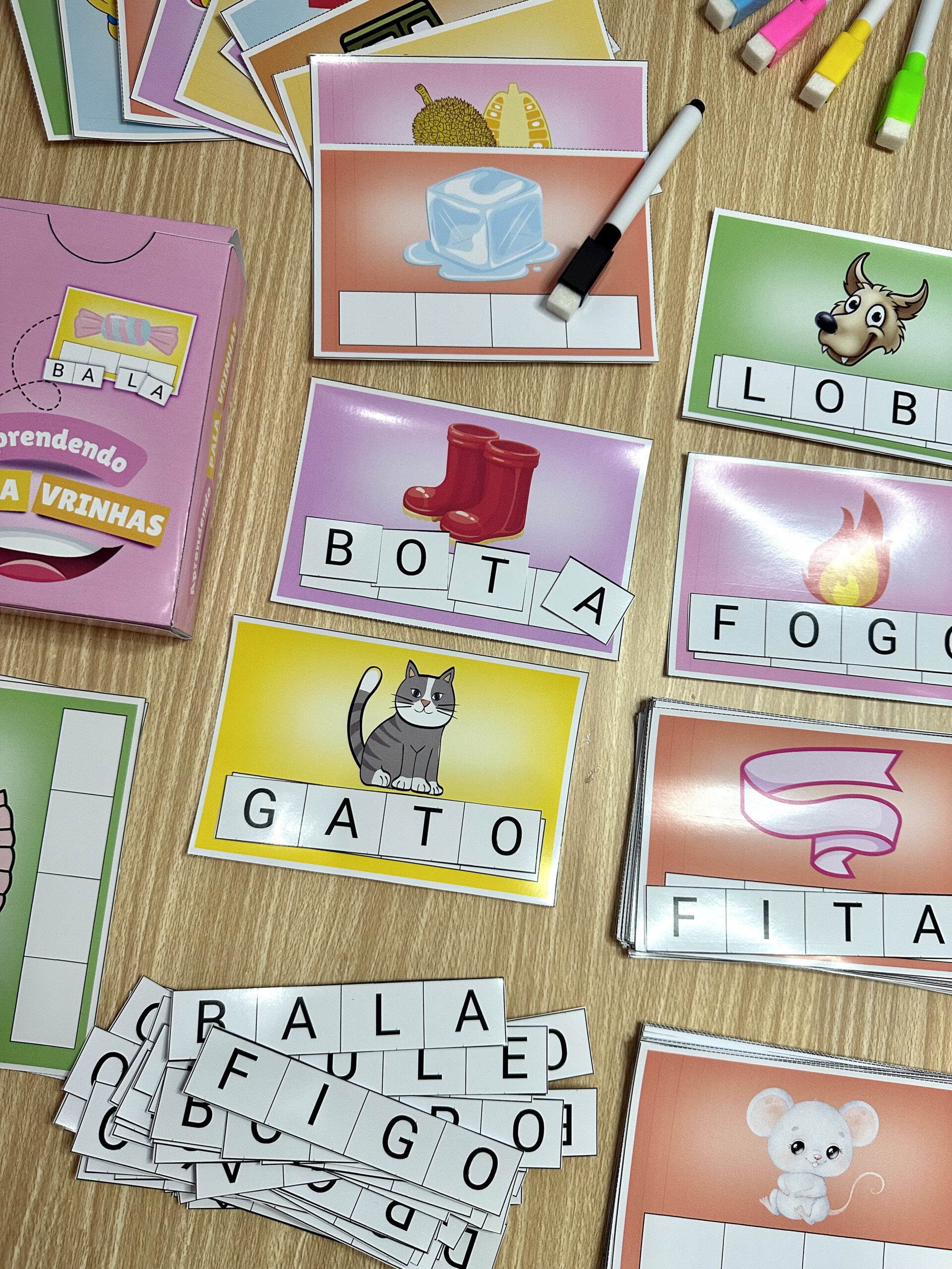 O arquivo inclui 72 fichas de palavras para trabalhar a escrita através de letras móveis. São palavras de sílabas simples, de duas sílabas, para auxiliar crianças em fase de alfabetização. As fichas também podem ser utilizadas com canetas para quadro branco. Nesse caso, existe a possibilidade de passar papel contact ou fita adesiva larga, para a reutilização do material. Com essa proposta é possível estimular as seguintes habilidades e conteúdos: