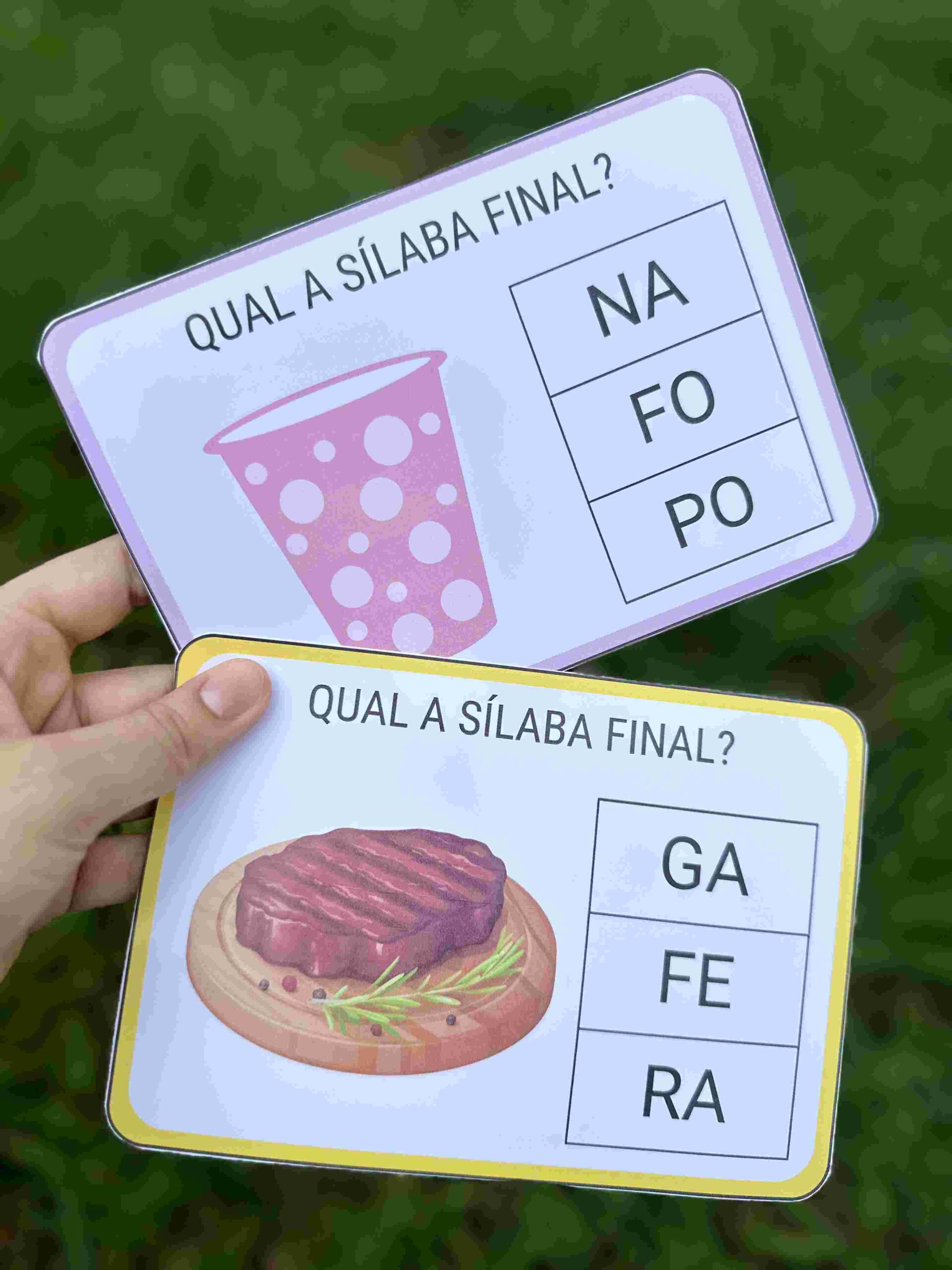 - Desafio da Sílaba Final: Cada ficha apresenta uma palavra em destaque, e a criança precisa pensar sobre a formação da palavra e identificar qual é a sonoridade da última sílaba, fazendo a associação com sua representação gráfica.